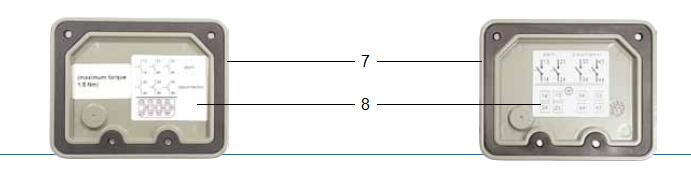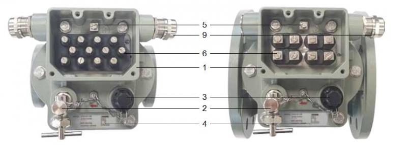 頂蓋是由耐氣候變化的鑄鋁合金制成,表層已涂色. 頂蓋部件上部有一個接線盒(圖4中1),在接線盒前面有一個放氣閥(圖4中2)和一個用悶蓋螺母(圖4中3)覆蓋的測試按鈕,同時上面還附有一個測試按鈕操作說明標牌(圖4中4). 接線盒中除了有一個接地點(圖4中5)外,頂蓋底板內還裝有電力引線端子(圖4中6). 通過電力引線端子的數量可以決定涉及干簧管類型與數量的開關系統(tǒng)的布線配置.